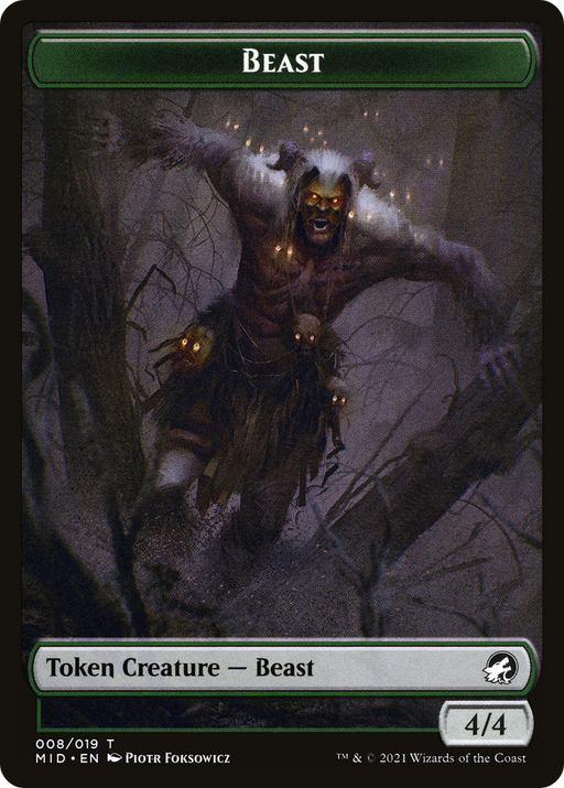 Innistrad: Midnight Hunt TokensRupture de stockCard TypeToken Creature — Beast RarityCommon ArtistPiotr Foksowicz Power/Toughness4/4 Le...