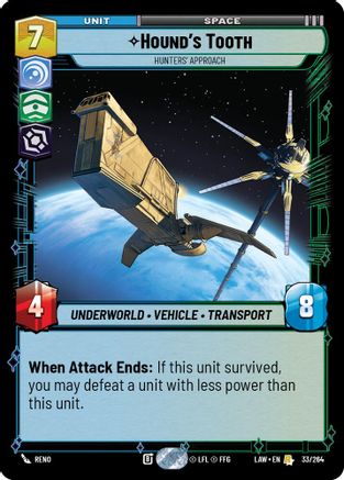 Card TypeUnit AspectCommand, Vigilance, Villainy TraitsUnderworld, Vehicle, Transport ArenaSpace Power4 Cost7 ...